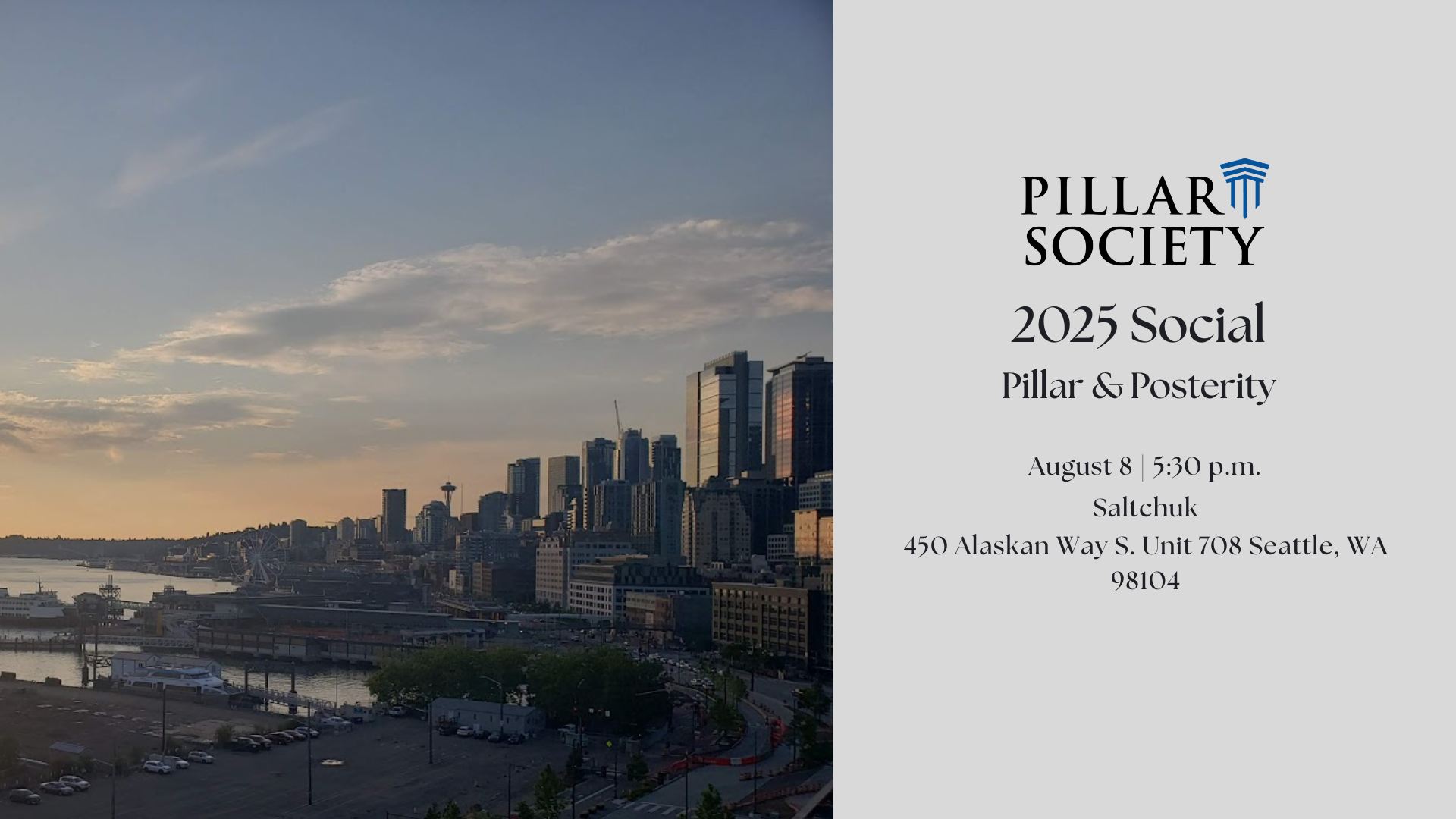 We hope you’ll join us on August 8 for an evening of connection, policy insights, and great food and wine. We’ll be gathering in Seattle at Saltchuk, generously being made available by fellow Pillar Society member Jason Childs.