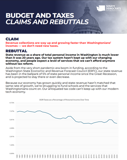 Leadership of Washington State Senate Democrats have circulated a communications document arguing Washington's tax code is "broken." They assert the state is being "defunded" because state revenue as a percentage of “total personal income” has declined over 20 years, from a historical 6-7% to approximately 5%. The document attempts to push back against the mounting opposition from Washingtonians who want relief from the state's relentless tax increases.