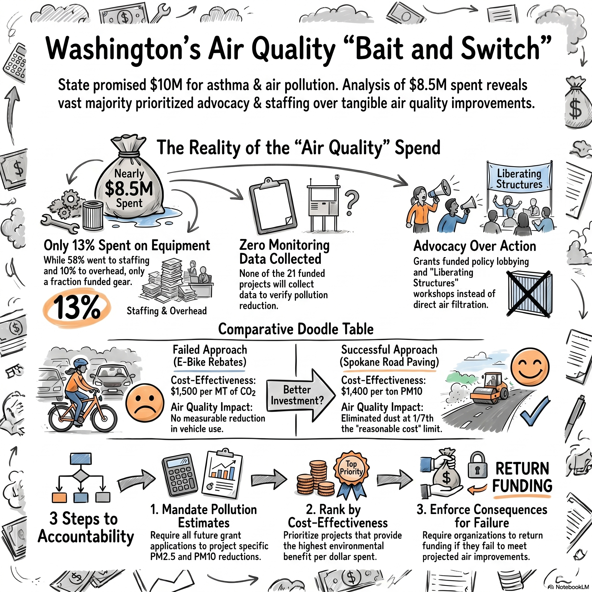 The only project that meaningfully addressed air pollution in a cost-effective way was a Spokane project that reduced dust from an unpaved road. This grant did two things that none of the others did: it provided an actual projection of the pollution reduced by the project and estimated the cost-effectiveness of the program by comparing it to standard metrics.