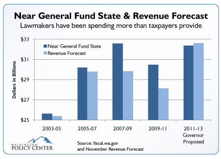A combination of past spending decisions and a historic economic downturn has left lawmakers in Olympia facing many difficult choices to reset state spending. Though tax revenues dropped substantially for the 2009-11 budget, they are projected to increase by $4.5 billion for the 2011-13 budget. While this should be cause for celebration, lawmakers for years have been spending more than taxpayers were providing, creating a structural budget gap that now threatens popular programs. This past overspending has been exacerbated by the “great recession.”