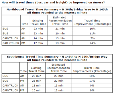 City officials claimed reserving lanes would make commuting 24% faster in the PM Peak heading northbound on a stretch of SR-99 by reducing a 17-minute commute to 13 minutes. They estimated southbound trip times in the evening would drop by two minutes, a nine percent time savings over previous levels (see SDOT projections below).