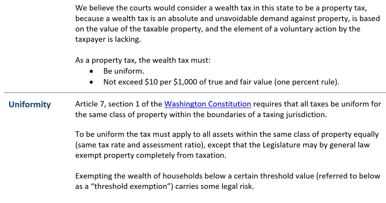 “There is litigation risk that the courts would invalidate the wealth tax on the grounds that it is a property tax that conflicts with the uniformity provisions of Article VII, Section 1 of the Washington Constitution.”