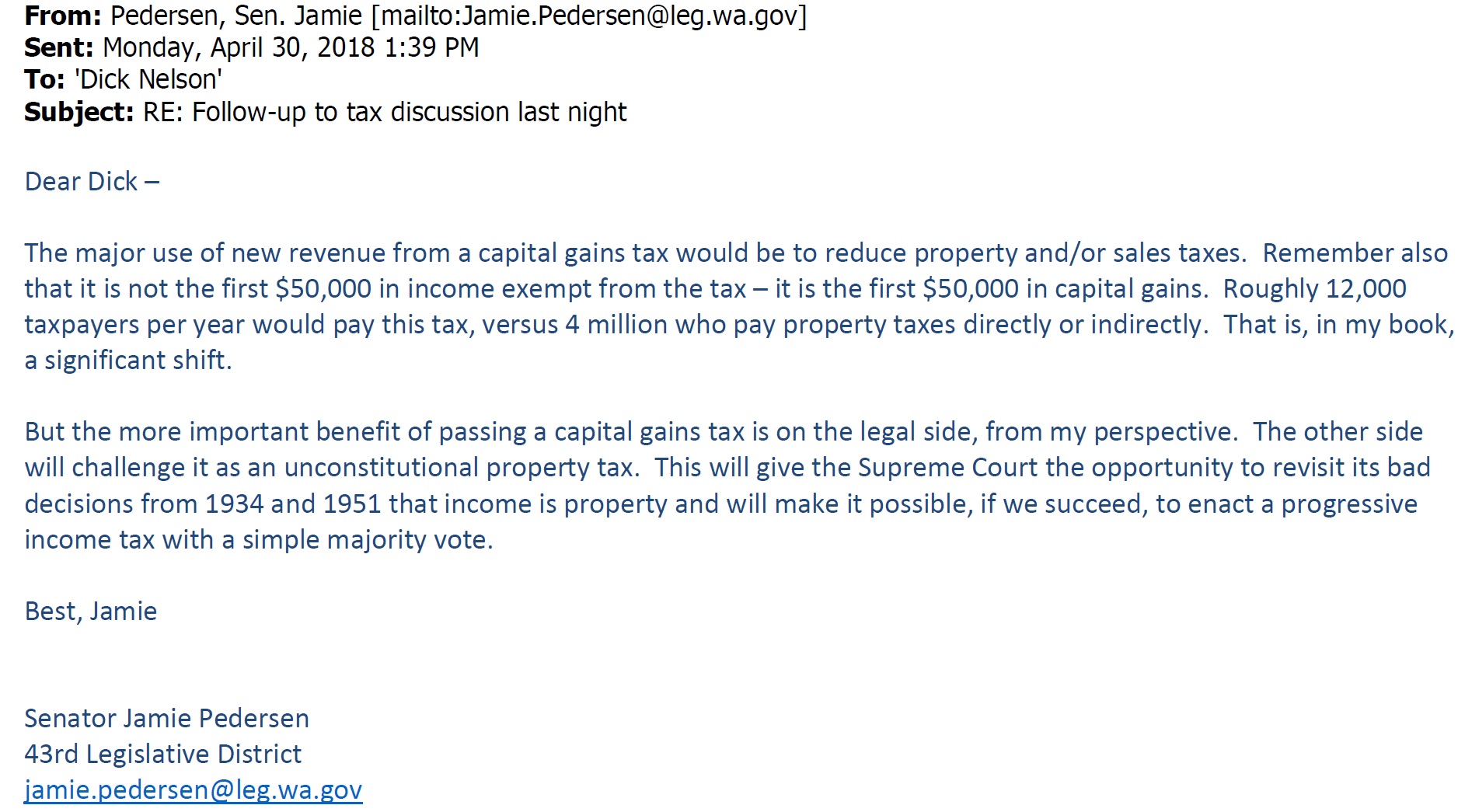 House adopts income tax on capital gains 52-46. Now we wait to see if Senate concurs with changes prohibiting the people's right of referendum.