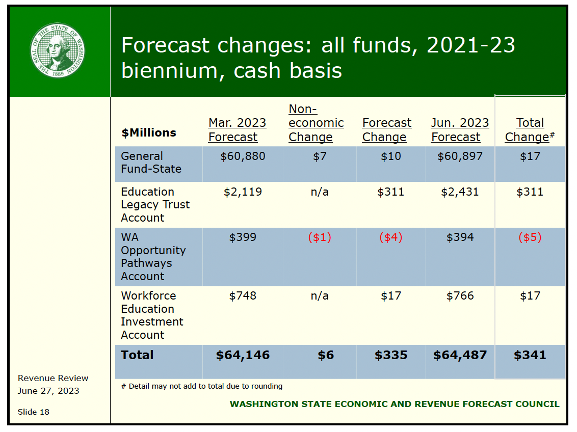 The Washington State Economic and Revenue Forecast Council met yesterday to present the Q2 2023 economic and revenue forecast. You can find the recording of the meeting here and the meeting documents here.