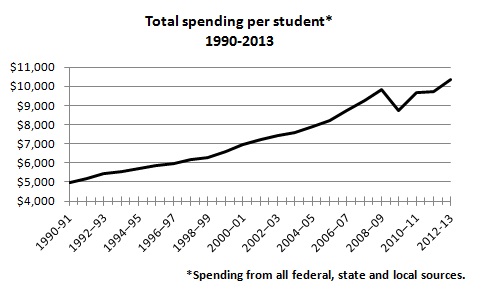 Spending per student has increased by 28% since 1990, in inflation-adjusted dollars. In other words, taxpayers are providing nearly one-third more money to educate each student than in the past.