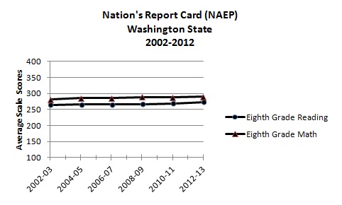 Academic outcomes also remain flat. The average scale scores for Washington students on the nation’s report card, the National Assessment of Educational Performance (NAEP), consistently fall between 200-300, out of a possible score of 500. Trend data on academic outcomes for Washington state public school students has remained largely unchanged for years.