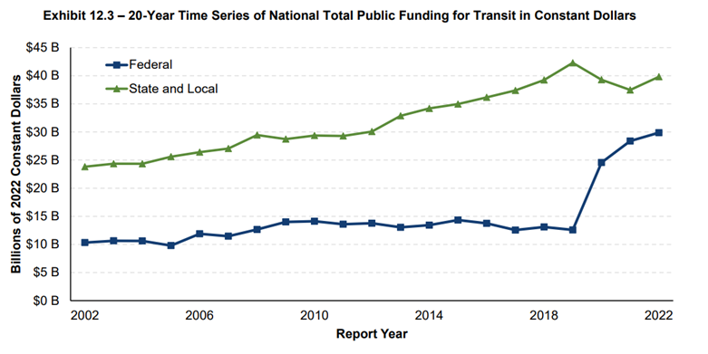 The question that should be asked is whether continued Federal transit subsidies are really solving transit’s problem. We can get a sense of that from looking at funding, ridership, and cost trends. What the data shows is that ridership is lower today than it was ten years ago despite a very large increase in subsidy. The graph below shows the increase in transit funding from Federal and state/local sources. The total, which increased rapidly during the COVID pandemic, now exceeds $70 billion per year.