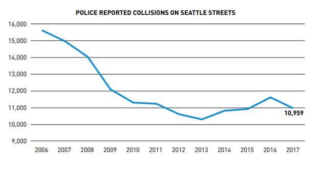 Though these crashes are notable, Seattle’s DOT reports that police-reported collisions are “near historically low levels” despite an increase in population:
