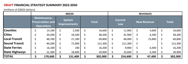 The staff of the Puget Sound Regional Council (PSRC) – the federally mandated metropolitan planning organization – has released a draft financial strategy for the 2050 regional transportation plan (RTP). That strategy includes new ways to get more money from the public to fund politicians’ transportation priorities – including: