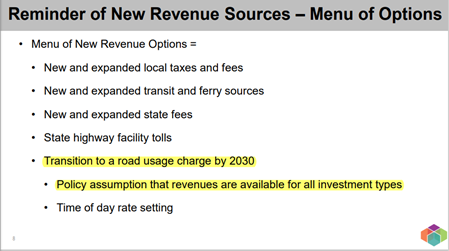 “indexing existing taxes; new taxes such as a carbon tax, motor vehicle excise tax and street utility tax; paid parking surcharges; impact fees; increases to transit and ferry fares; increases to sales taxes and various registration and license fees; as well as transportation facility tolls and a road usage charge in the future.”