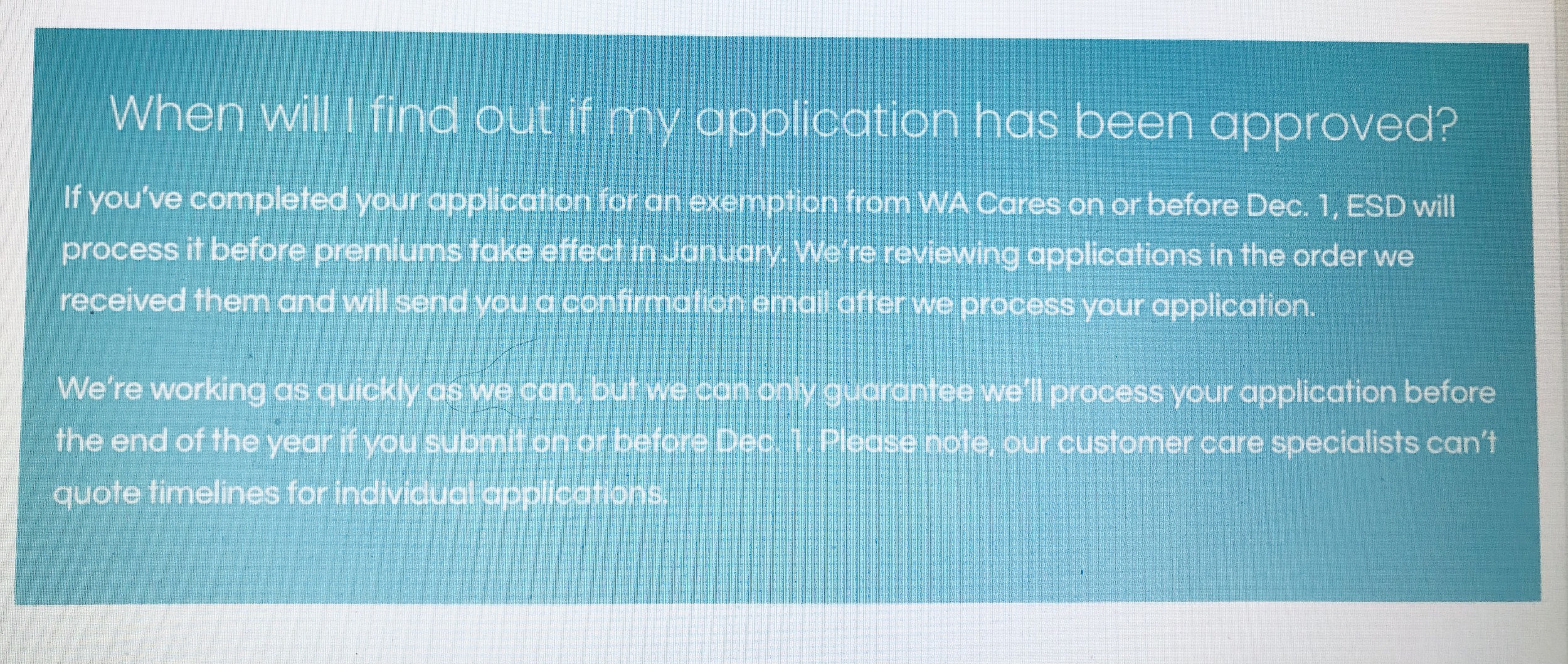 Today, the WA Cares Fund website offered more clarification. It carried an updated exemption message that reads, “If you’ve completed your application for an exemption from WA Cares on or before Dec. 1, ESD will process it before premiums take effect in January,” and, “we can only guarantee we’ll process your application before the end of the year if you submit on or before Dec. 1.”